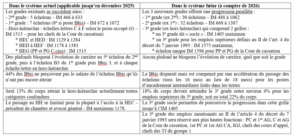 Cette réforme, reportée du fait de la dissolution de l’Assemblée nationale en juin 2024, a été adoptée par décrets du 30 et 31 octobre 2025 et entrera enfin en vigueur au 1er décembre 2025, conformément à l’échéance fixée par la loi organique du 20 novembre 2023 qui crée un 3e grade en remplacement de l’actuelle « hors hiérarchie ».
